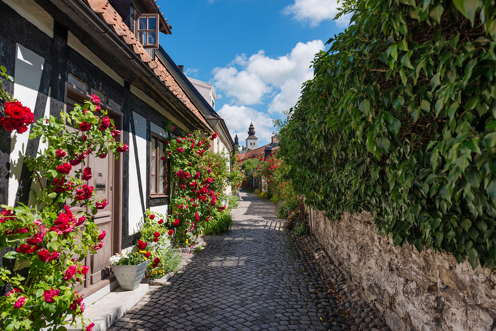 Fiskargränd i Visby är fotograferad under en stillsam sommardag, när rosorna står i full blom längs de låga husfasaderna. Den smala kullerstensgränden ligger tyst och tom, inramad av grönska, färg och historiska detaljer.
